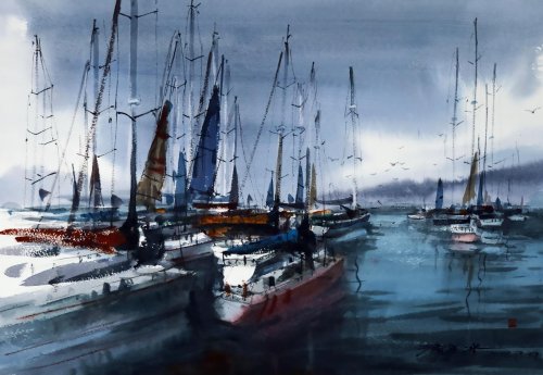 这份对视觉美的敏感,在 12 岁那年迎来转折。当他在教室门口撞见老师用粉笔绘制的满黑板石榴树,那种跃动的生命力让他彻夜难眠。此后师从当地书法家的研习,不仅让他的书法作品被翰园碑林收录,更练就了腕底千钧的线条控制力。这份童子功在日后成为他水彩创作的 "隐形骨架"—— 就像他常对学生说的:"书法里的 ' 屋漏痕 ' 笔法,与水彩画的运笔节奏本就同源。"