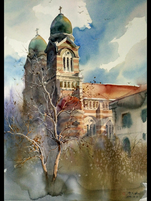 滑寒冰的水彩世界,是一场持续三十年的中西美学对话。在华中师范大学求学期间,刘寿祥先生透明水彩的光影魔法,与他自幼浸润的水墨意境产生奇妙共振。他在画案前反复实验:如何让宣纸的晕染特性嫁接到水彩纸?怎样用油画刀的刮擦技法模拟碑刻质感?最终形成 "水彩遇上水墨" 的独特语言 —— 在《西开教堂》系列中,教堂穹顶的光影被解构为水墨皴法,而琉璃窗的色彩则保留水彩的透明特质,明暗交界处那道若有似无的飞白,恰似传统绘画中的 "计白当黑"。