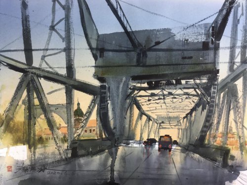 这种跨界思维在构图上尤为显著。他从长沙马王堆锦缎的云气纹中提取流动感,将明清家具的榫卯结构转化为画面骨架,甚至把《周易》的阴阳爻变图式融入色块布局。在描绘五大道建筑群时,他刻意将西洋立柱与中式瓦当并置,通过水彩的湿画法让两种建筑语汇在水色交融中对话。这种 "大实大虚" 的画面处理,打破了西方水彩不留白的传统,被评论家称为 "用西方颜料写东方诗境"。