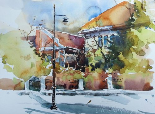 翻开他的写生本,仿佛打开一部立体的天津建筑史。漫步意式风情区,拱券被拆解为书法中极具韵律的 “波磔” 笔法;穿行五大道,洋房的老虎窗化作画面里灵动的 “透气孔”;驻足古文化街,砖雕纹样幻化为水彩画中精妙的笔触。这些浸润着天津地域特色的创作,不仅被精心收录进《津门建筑水彩谱系》,更成为他发起 “水彩画中的天津” 学术项目的灵感源泉。他带领学生们以画笔为媒介,为这座城市的建筑文化建档,让天津的独特魅力在艺术创作中得以永恒留存。
